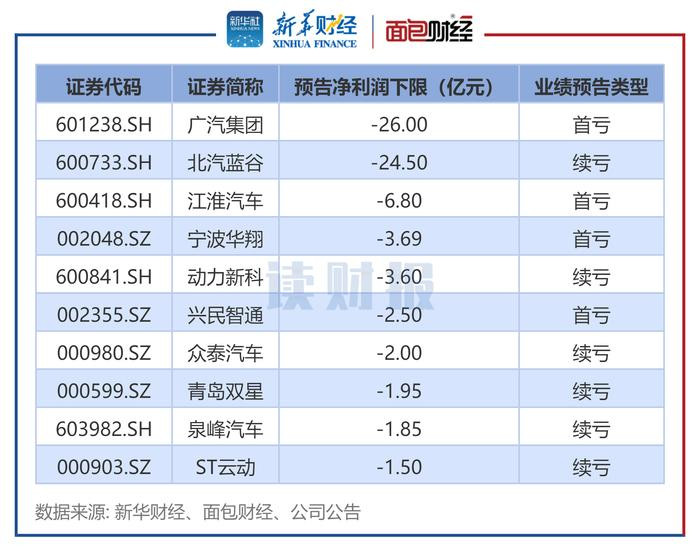 统计数据显示,截至2025年7月16日,有33家A股汽车行业上市公司预告归母净利润下限为负,呈亏损状态。亏损前两位的公司分别是广汽集团、北汽蓝谷,预计亏损规模均超过20亿元,江淮汽车、宁波华翔等4家公司亏损超3亿元。