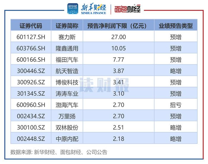 以预告归母净利润下限统计,11家公司预计归母净利润超过2亿元。其中,赛力斯的预告归母净利润下限为27亿元,位列第一;隆鑫通用、福田汽车的预告归母净利润下限为10.05亿元、7.77亿元,位列第二、第三。